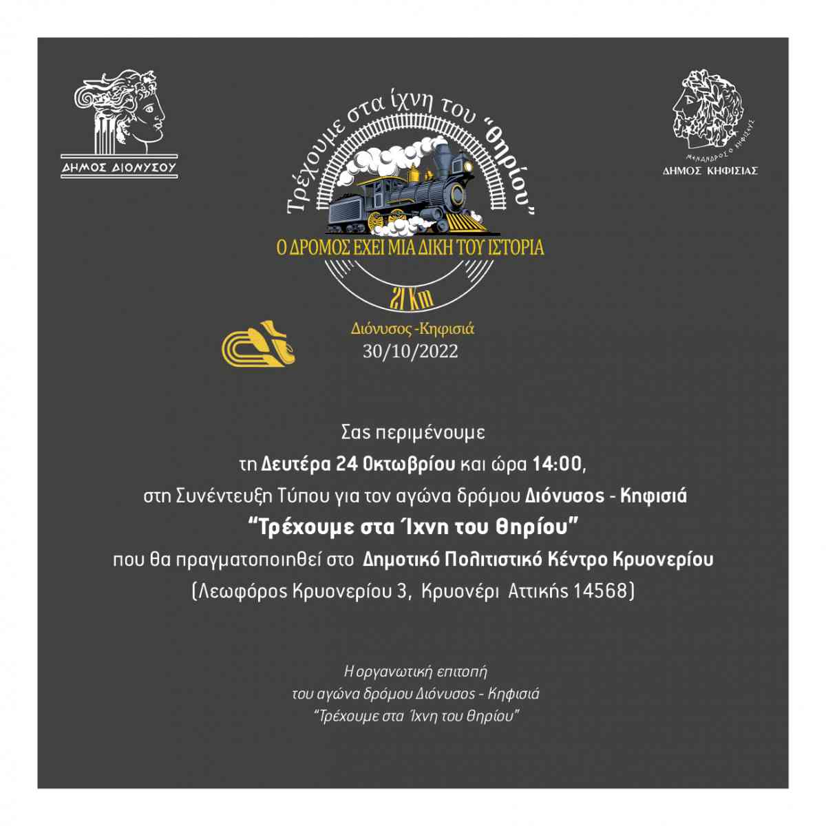 Τα ίχνη του... «θηρίου» θα ακολουθήσουν οι δρομείς του ημιμαραθωνίου δρόμου που θα διεξαχθεί στον Διόνυσο και την Κηφισιά, ενώνοντας τους δύο όμορους Δήμους, την Κυριακή 30 Οκτωβρίου. Πρόκειται για μια διοργάνωση με έντονο το ιστορική στίγμα καθώς οι συμμετέχοντες θα διανύσουν μοναδικές διαδρομές, ακολουθώντας τα χνάρια του «θηρίου», του πρώτου ατμοκίνητου προαστιακού σιδηροδρόμου της Αθήνας! Το πρόγραμμα της σπουδαίας διοργάνωσης περιλαμβάνει ημιμαραθώνιο δρόμο, αγώνα δρόμου 5 χλμ. καθώς και αγώνα παιδιών αλλά και ΑΜΕΑ με αμαξίδιο. Οι προβολείς του δρομικού κινήματος στρέφονται στις υπέροχες διαδρομές δίπλα στη φύση, αναδεικνύοντας την ομορφιά των δύο Δήμων και προσελκύοντας παράλληλα το τουριστικό ενδιαφέρον στην ευρύτερη περιοχή.