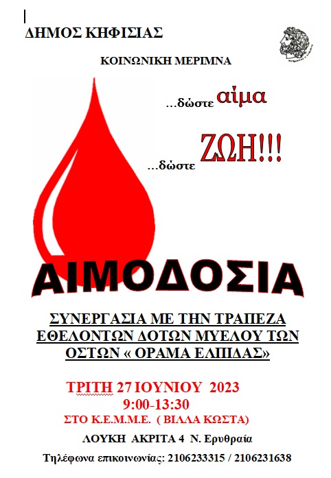 ΗΜΕΡΑ ΕΘΕΛΟΝΤΙΚΗΣ ΑΙΜΟΔΟΣΙΑΣ ΓΙΑ ΤΗΝ ΔΗΜΟΤΙΚΗ ΤΡΑΠΕΖΑ ΑΙΜΑΤΟΣ ΤΟΥ ΔΗΜΟΥ ΚΗΦΙΣΙΑΣ