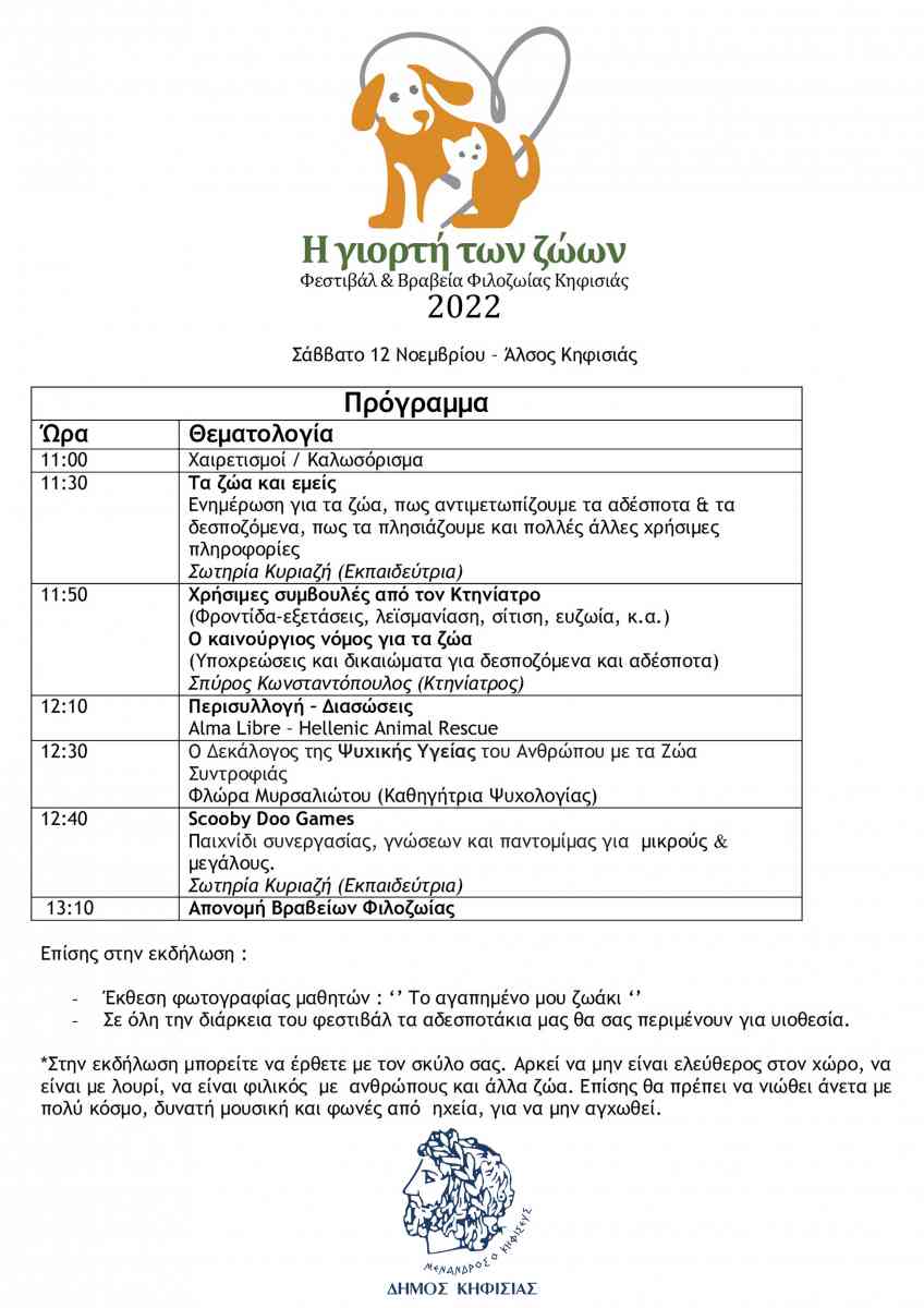Η ‘Γιορτή των Ζώων’ στην Κηφισιά, πλαισιώνεται με δράσεις όπως, πληροφορίες και χρήσιμες συμβουλές φροντίδας καθώς και ενημέρωση για το νομοθετικό πλαίσιο που τα προστατεύει.