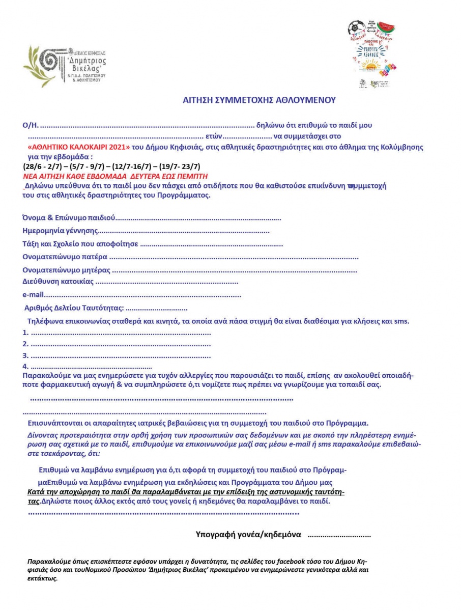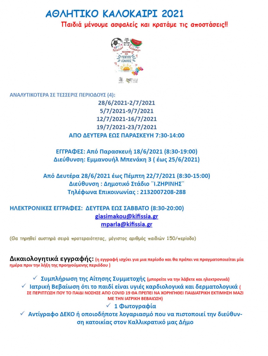 Το Αθλητικό Καλοκαίρι 2021 θα παρέχεται δωρεάν και θα απευθύνεται σε παιδιά των Δημοτών - Κατοίκων Κηφισιάς , Νέας Ερυθραίας και Εκάλης.