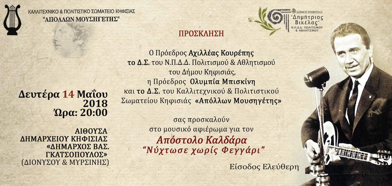 Ο Πρόεδρος Αχιλλέας Κουρέπης, το Δ.Σ. του Ν.Π.Δ.Δ. Πολιτισμού & Αθλητισμού «Δημήτριος Βικέλας» του Δήμου Κηφισιάς, η Πρόεδρος Ολυμπία Μπισκίνη & το Δ.Σ. του Καλλιτεχνικού & Πολιτιστικού Σωματείου Κηφισιάς «Απόλλων Μουσηγέτης» διοργανώνουν τη Δευτέρα 14 Μαΐου 2018 και ώρα: 20:00 στην αίθουσα του Δημαρχείου Κηφισιάς «Δήμαρχος Βασ. Γκατσόπουλος» ένα αφιέρωμα στον μεγάλο Έλληνα συνθέτη Απόστολο Καλδάρα.