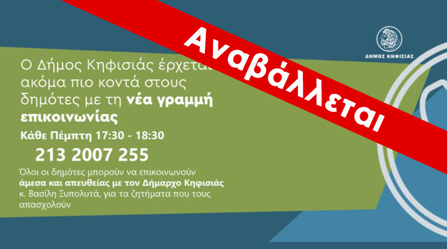 Εκτάκτως σήμερα, Πέμπτη 29 Μαΐου, αναβάλλεται η λειτουργία της "Γραμμής του Δημότη", λόγω συμμετοχής του Δημάρχου Κηφισιάς, Βασίλη Ξυπολυτά σε σύσκεψη με τον Υπουργό Κλιματικής Κρίσης και Πολιτικής Προστασίας, Γιάννη Κεφαλογιάννη στο πλαίσιο των πρωτοβουλιών για την "θωράκιση" του Δήμου μεσούσης της αντιπυρικής περιόδου.