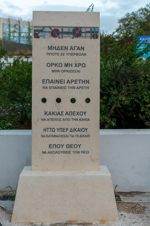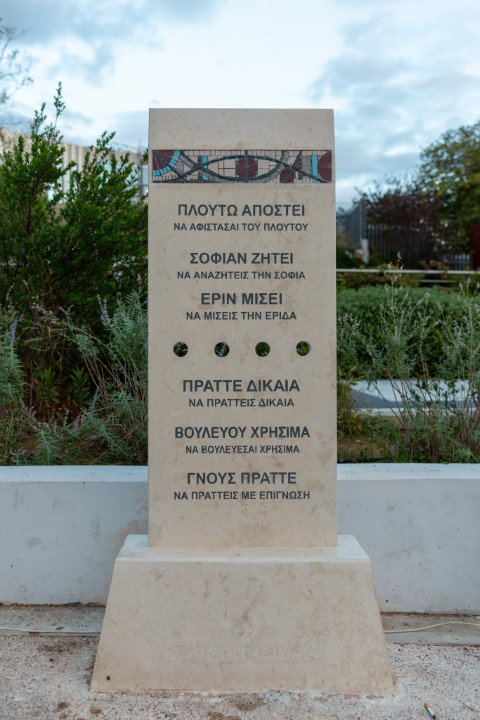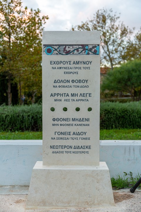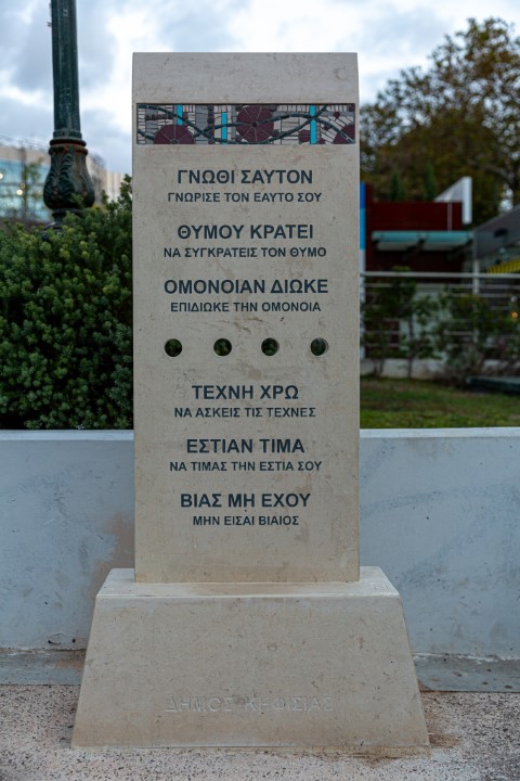 Δελφικά Παραγγέλματα των Επτά Σοφών της αρχαιότητας, που χαράχτηκαν στους τοίχους του μαντείου των Δελφών προκειμένου να εντυπωθούν για πάντα στη συλλογική συνείδηση των πολιτών, αναβιώνουν στην πλατεία πάνω από το Alsos Parking στον Δήμο Κηφισιάς.