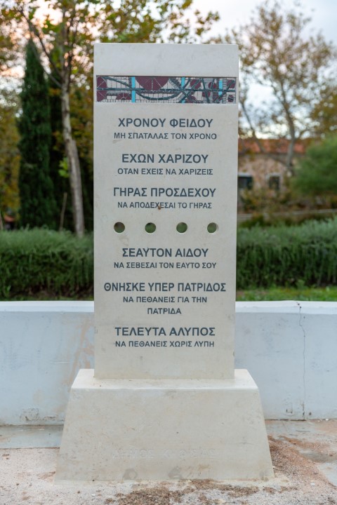 Έτσι και εμείς, τα Δελφικά παραγγέλματα, τα κάναμε στήλες που διακοσμούν αυτό το όμορφο πάρκο της πόλης μας. Τα κάναμε στήλες για να τα διαβάζουμε και να παιδευόμαστε (το παιδευόμαστε με την έννοια του εκπαιδευόμαστε).