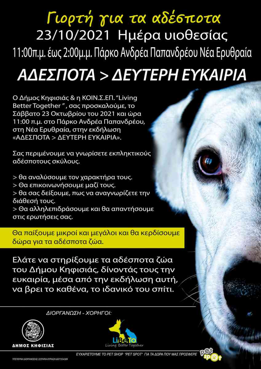 Ο Δήμος Κηφισιάς και η “Living Better Together KΟΙΝΣΕΠ”, σας προσκαλούμε το Σάββατο 23 Οκτωβρίου του 2021 και ώρα 11:00 π.μ. στο Πάρκο Ανδρέα Παπανδρέου στη Νέα Ερυθραία, στην εκδήλωση «ΑΔΕΣΠΟΤΑ - ΔΕΥΤΕΡΗ ΕΥΚΑΙΡΙΑ».