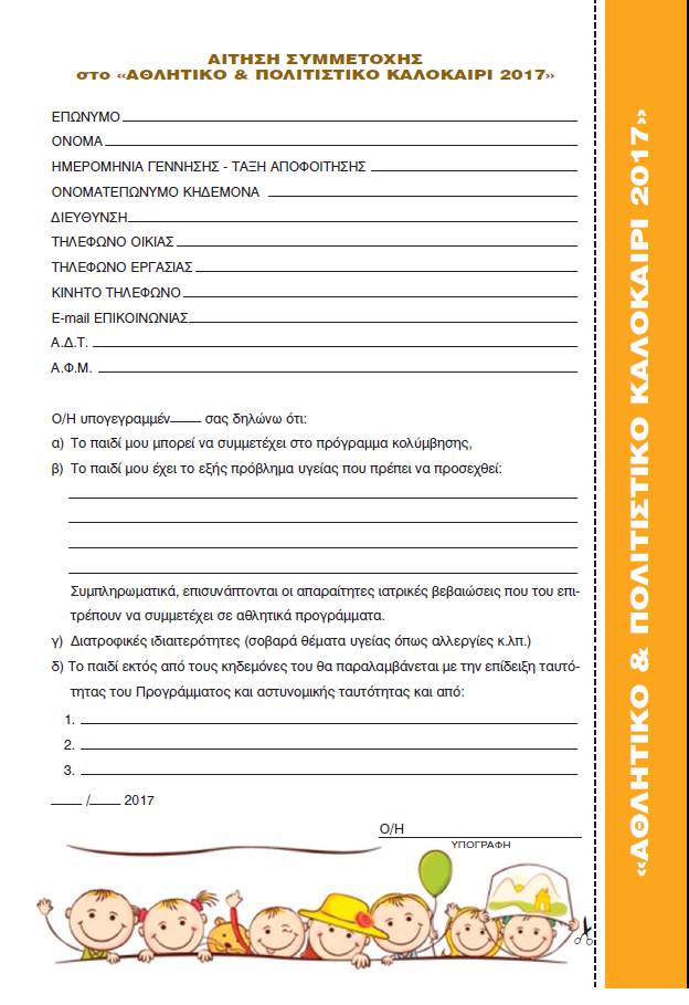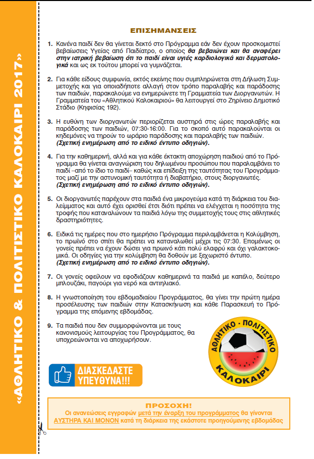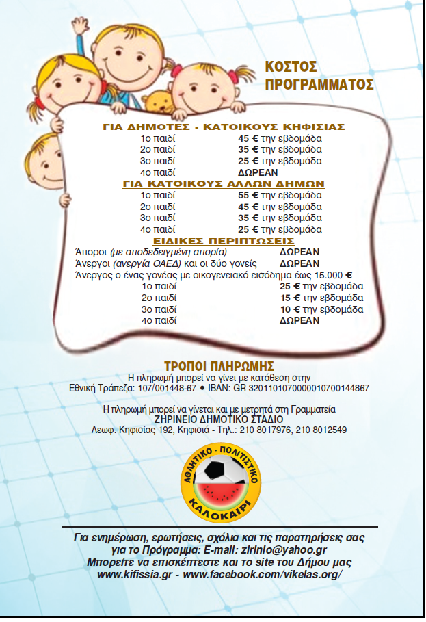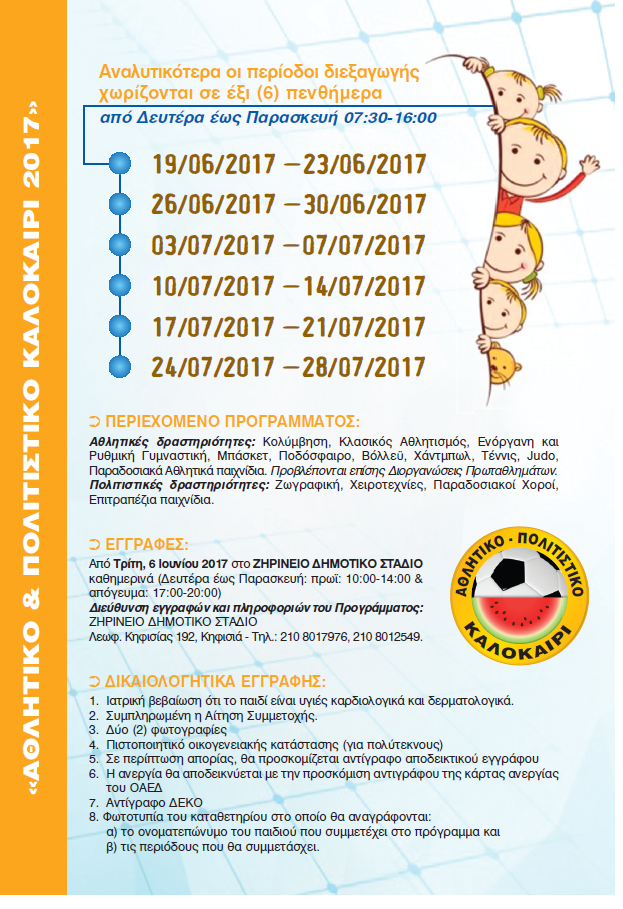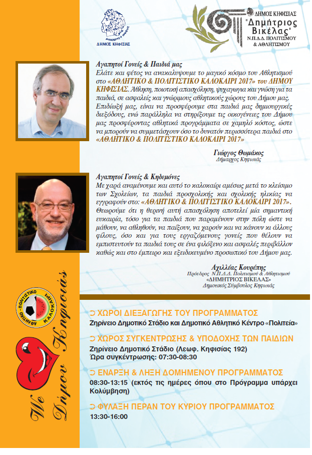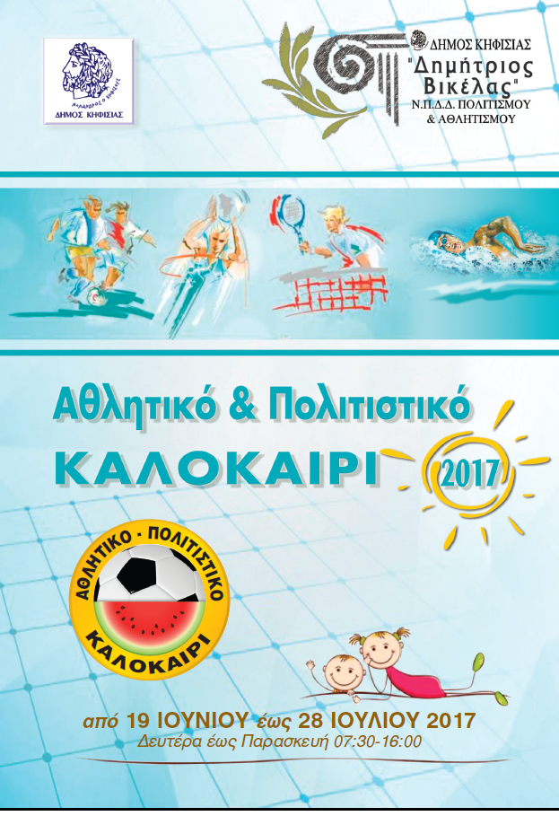 Το πρόγραμμα «Αθλητικό και Πολιτιστικό Καλοκαίρι 2017» θα διεξαχθεί και πάλι φέτος από τις 19 Ιουνίου έως τις 28 Ιουλίου 2017 στον Δήμο Κηφισιάς.