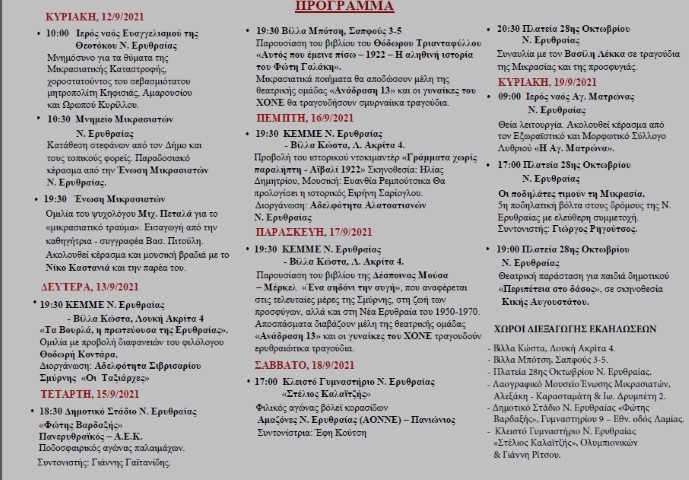 • 10:30 Μνημείο Μικρασιατών Ν. Ερυθραίας Κατάθεση στεφάνων από τον Δήμο και τους τοπικούς φορείς. Παραδοσιακό κέρασμα από την Ένωση Μικρασιατών Ν. Ερυθραίας.