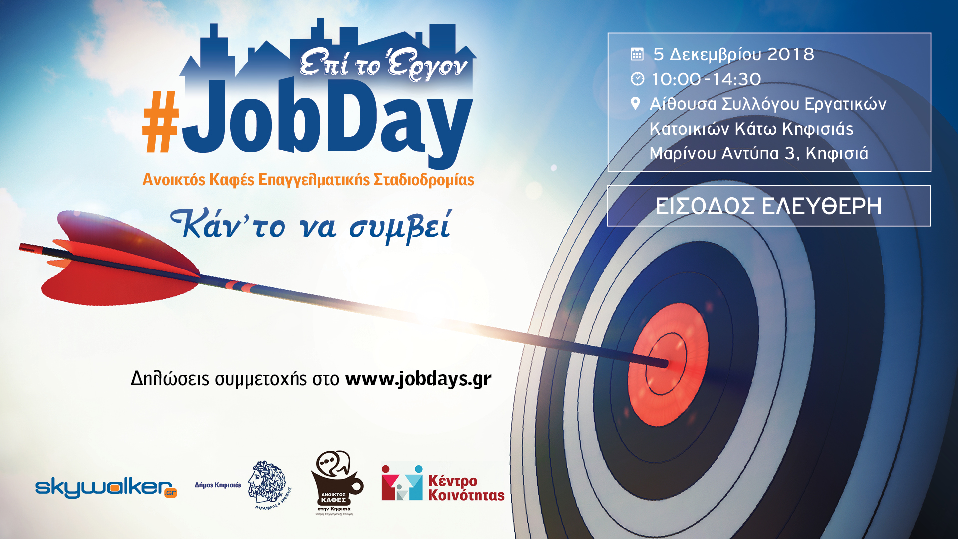 Το Τμήμα Επιχειρηματικότητας και Τουρισμού και το Κέντρο Κοινότητας του Δήμου Κηφισιάς σε συνεργασία με το skywalker.gr, διοργανώνουν τη Δράση «Ανοικτός Καφές Επαγγελματικής Σταδιοδρομίας#JobDay», ο οποίος θα πραγματοποιηθεί στην Αίθουσα Συλλόγου Εργατικών Κατοικιών, Μαρίνου Αντύπα 3 στην Κ.Κηφισιά.