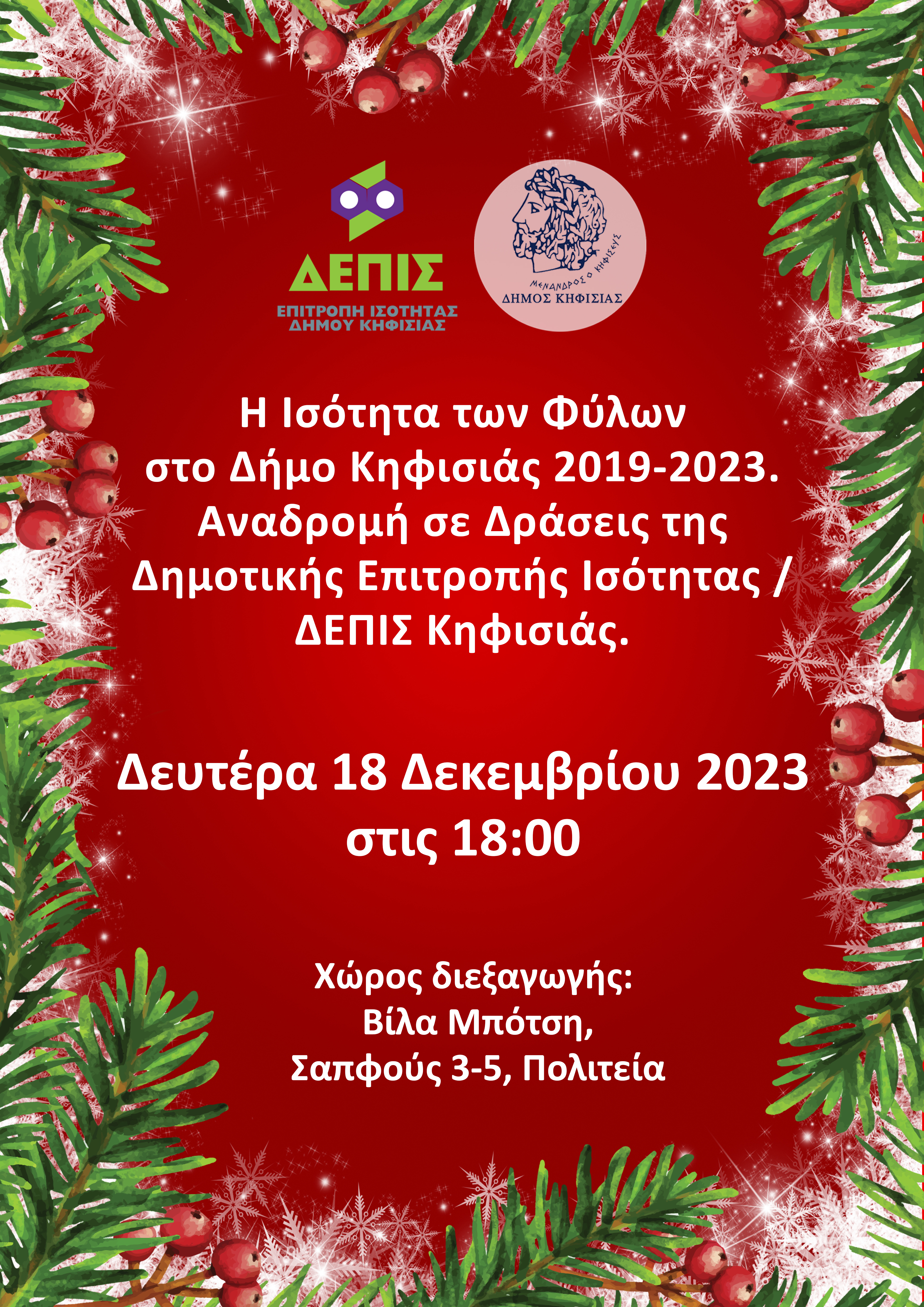 Η Δημοτική Επιτροπή Ισότητας του Δήμου Κηφισιάς (ΔΕΠΙΣ) διοργανώνει την τελευταία της εκδήλωση για την τρέχουσα δημοτική περίοδο 2019-2023, η οποία θα περιλαμβάνει έναν απολογισμό των δράσεων της ΔΕΠΙΣ Κηφισιάς. Η εκδήλωση με θέμα «Η Ισότητα των Φύλων στο Δήμο Κηφισιάς 2019-2023. Αναδρομή σε Δράσεις της Δημοτικής Επιτροπής Ισότητας/ΔΕΠΙΣ Κηφισιάς.», θα πραγματοποιηθεί τη Δευτέρα 18 Δεκεμβρίου στις 18:00, στη Βίλα Μπότση, Σαπφούς 3-5, Πολιτεία.