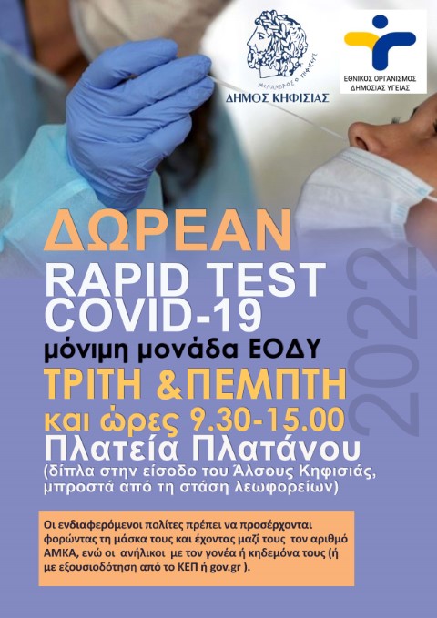 Σας ενημερώνουμε ότι από τη Τρίτη 15 Φεβρουαρίου 2022 και εφεξής, αλλάζει ο χώρος διεξαγωγής των δωρεάν rapid tests για COVID 19 από τον ΕΟΔΥ, στον Δήμο Κηφισιάς.