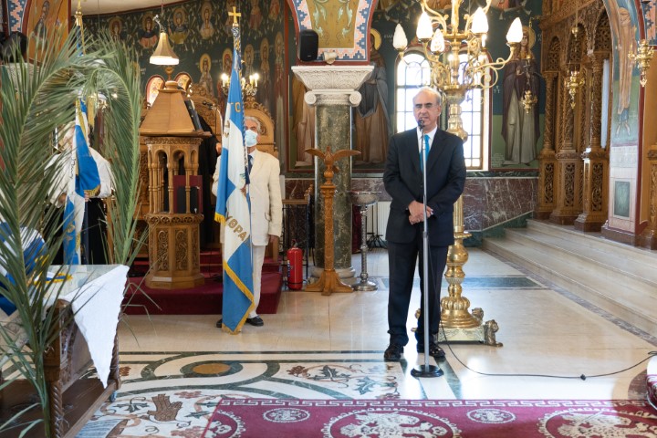 «Τη σημερινή ημέρα όλοι μας στρέφουμε το βλέμμα στον μαρτυρικό Χρυσόστομο Σμύρνης αγιογραφία του οποίου υποδέχεται τους πιστούς της Ευαγγελίστριας στην είσοδο του Ναού αλλά και στους χιλιάδες εθνομάρτυρες που σφαγιάστηκαν και σκοτώθηκαν επειδή ήταν Έλληνες και Χριστιανοί. Έπεσαν θύματα όχι μόνο του κεμαλικού μίσους και αγριότητας αλλά και εξαιτίας εθνικών λαθών που έχουν κοινό παρανομαστή τους το μόνιμο σαράκι της φυλής μας, τον εθνικό διχασμό.