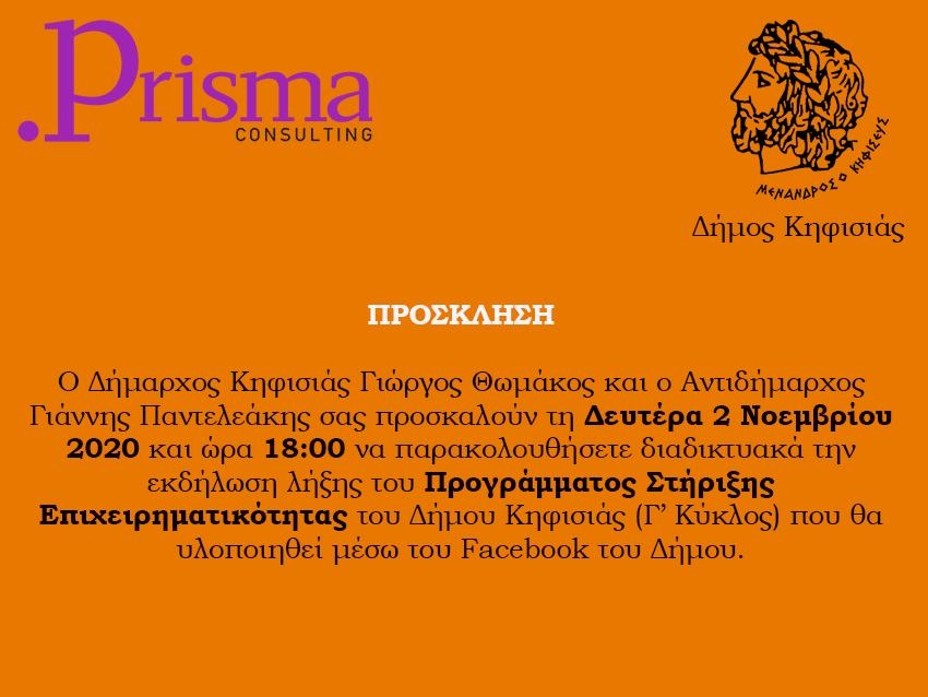 Ο Δήμαρχος Κηφισιάς Γιώργος Θωμάκος και ο Αντιδήμαρχος Γιάννης Παντελεάκης σας προσκαλούν τη Δευτέρα 2 Νοεμβρίου 2020 και ώρα 18:00 να παρακολουθήσετε διαδικτυακά την εκδήλωση λήξης του Προγράμματος Στήριξης Επιχειρηματικότητας του Δήμου Κηφισιάς (Γ’ Κύκλος) που θα υλοποιηθεί μέσω facebook του Δήμου.