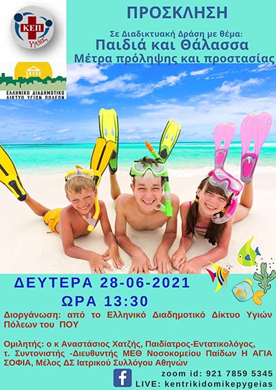 Τη Δευτέρα 28 Ιουνίου και ώρα 13.30 θα πραγματοποιηθεί Διαδικτυακή Ημερίδα με θέμα «Παιδιά και Θάλασσα. Μέτρα πρόληψης και προστασίας», από το Ελληνικό Διαδημοτικό Δίκτυο Υγιών Πόλεων του ΠΟΥ και τα ΚΕΠ Υγείας.
