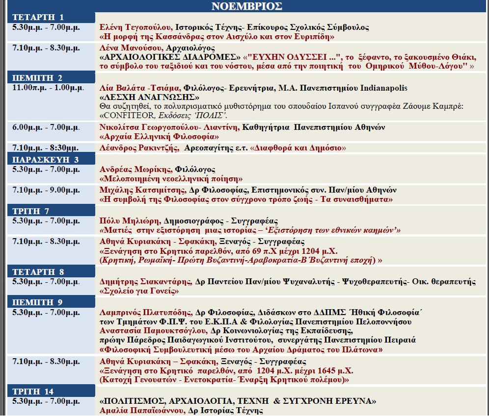 Επόμενες διαλέξεις στο Ελεύθερο Πανεπιστήμιο του Δήμου Κηφισιάς