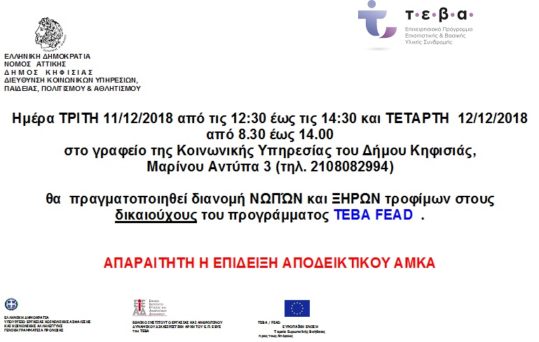 Στο πλαίσιο του Επιχειρησιακού Προγράμματος «Επισιτιστικής και Βασικής Υλικής Συνδρομής για το Ταμείο Ευρωπαϊκής Βοήθειας για τους Απόρους (TEBA/FEAD)», θα πραγματοποιηθεί από τον Δήμο Κηφισιάς διανομή νωπών και ξηρών τροφίμων στους δικαιούχους του προγράμματος ΚΕΑ – ΤΕΒΑ, στις 11/12/2018 (Ημέρα Τρίτη από τις 12.30 έως και τις 14.30) και 12/12/2018 (Ημέρα Τετάρτη 12/12/2018 από 8.30 έως 14.00), στο γραφείο Κοινωνικής Υπηρεσίας του Δήμου Κηφισιάς (Μαρίνου Αντύπα).