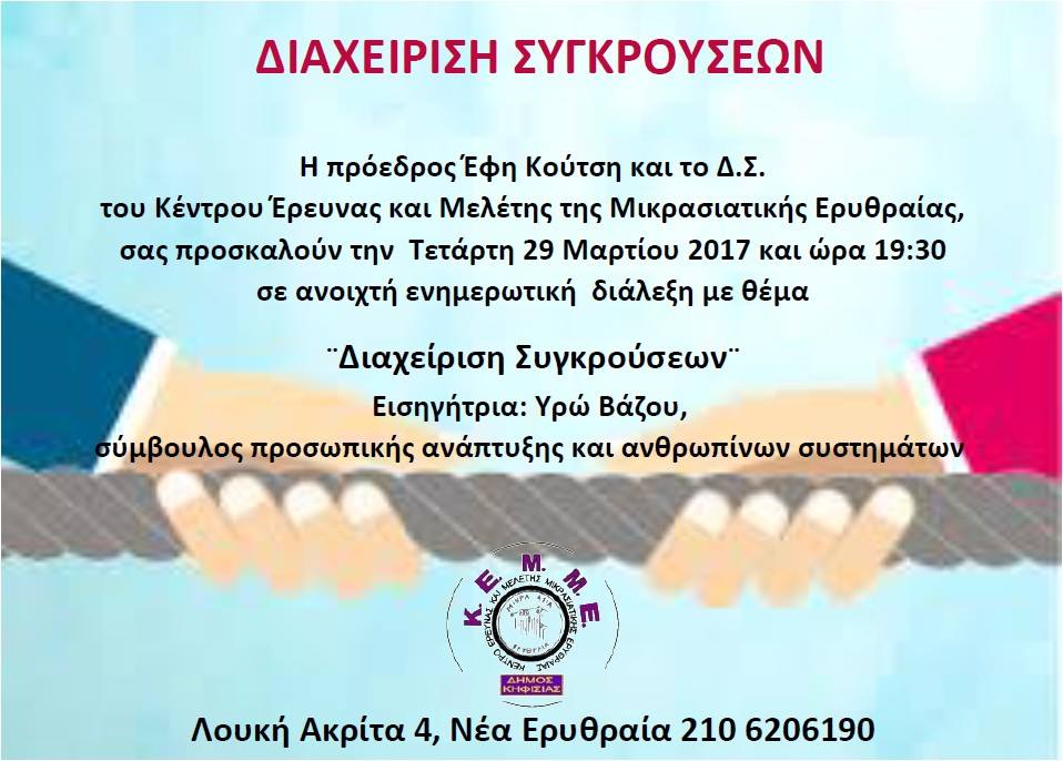 ''ΔΙΑΧΕΙΡΙΣΗ ΣΥΓΚΡΟΥΣΕΩΝ'' Μια σημαντική διάλεξη με την Υρώ Βάζου στο Κ.Ε.Μ.Μ.Ε