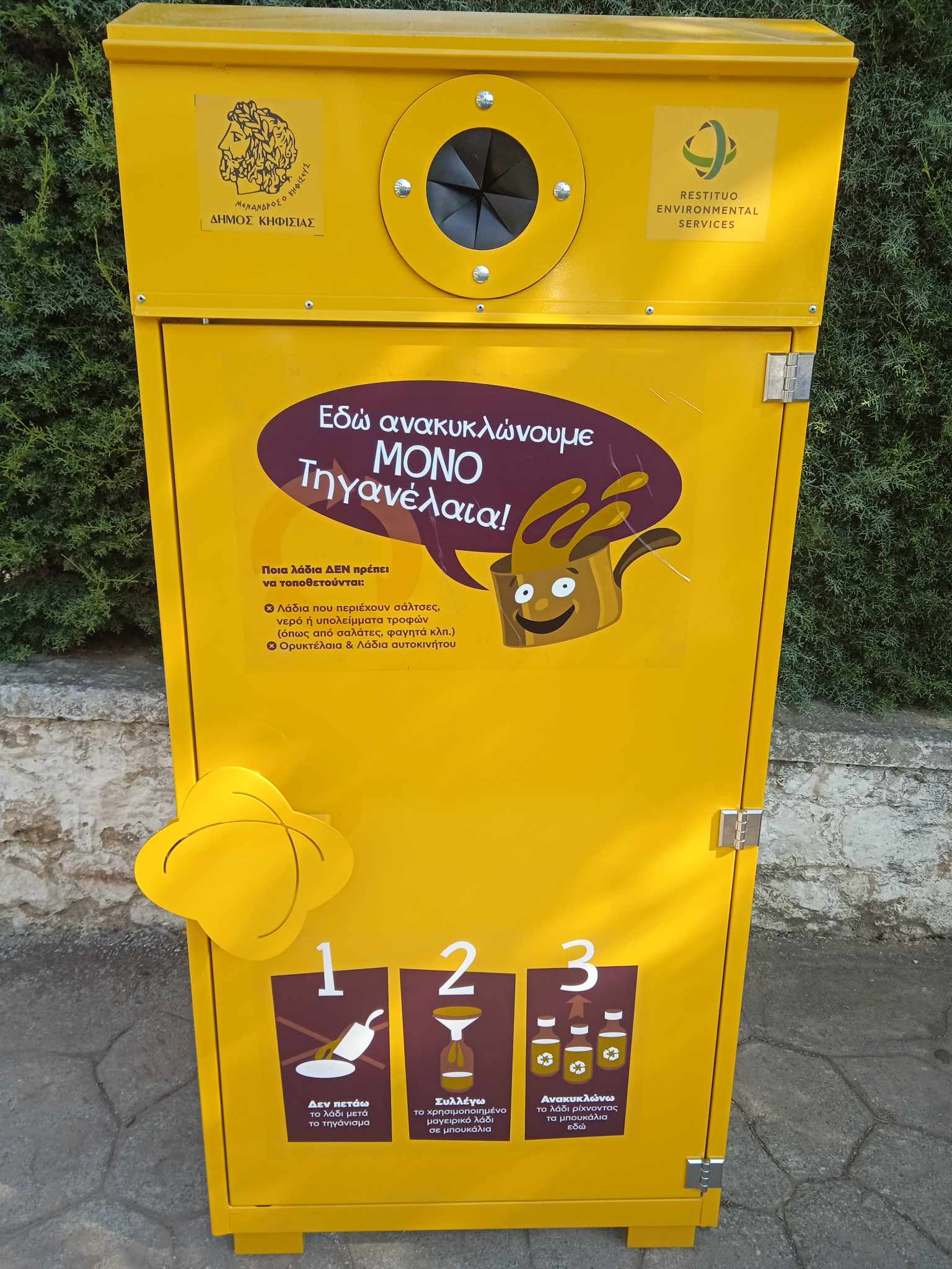 Στους ειδικούς αυτούς κάδους, οι πολίτες μπορούν να αποθέτουν τα χρησιμοποιημένα οικιακά μαγειρικά λάδια (σε πλαστικό ή χάρτινο δοχείο), αντί να τα απορρίπτουν στο περιβάλλον και τον υδροφόρο ορίζοντα.