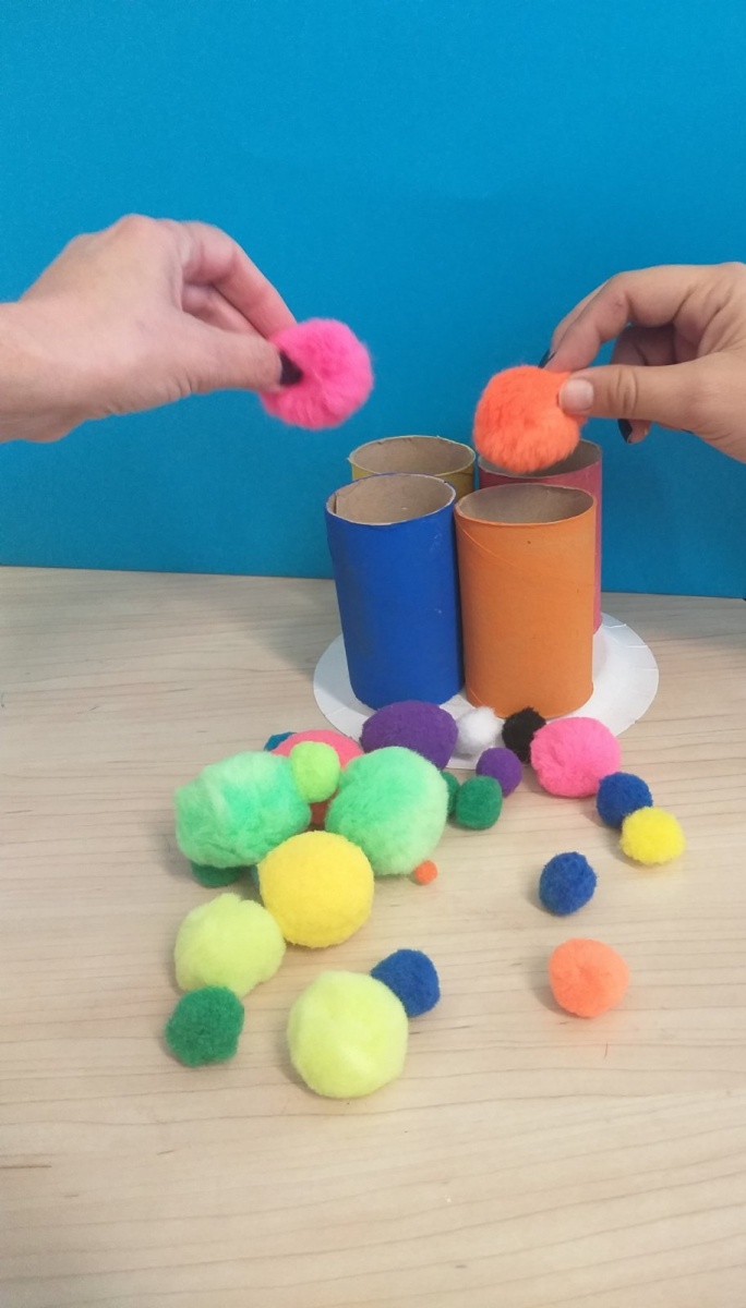 Παίρνουμε τα ponpon ή τα μπαλάκια από χαρτοπετσέτα που έχουμε φτιάξει κ προσπαθούμε να πετύχουμε τα ρολά.