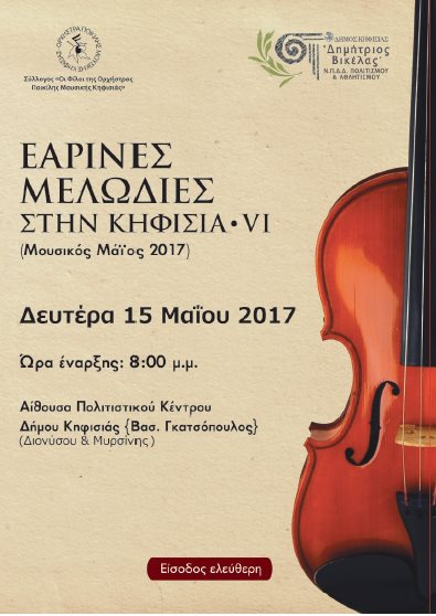 Ο Σύλλογος «Οι φίλοι της Ορχήστρας Ποικίλης Μουσικής Κηφισιάς» σε συνεργασία με το Ν.Π.Δ.Δ. Πολιτισμού και Αθλητισμού του Δήμου Κηφισιάς σας προσκαλεί στις τέσσερις συναυλίες που θα πραγματοποιηθούν και φέτος στo πλαίσιo της σειράς εκδηλώσεων «Εαρινές Μελωδίες στην Κηφισιά VΙ» (Μουσικός Μάϊος 2017).