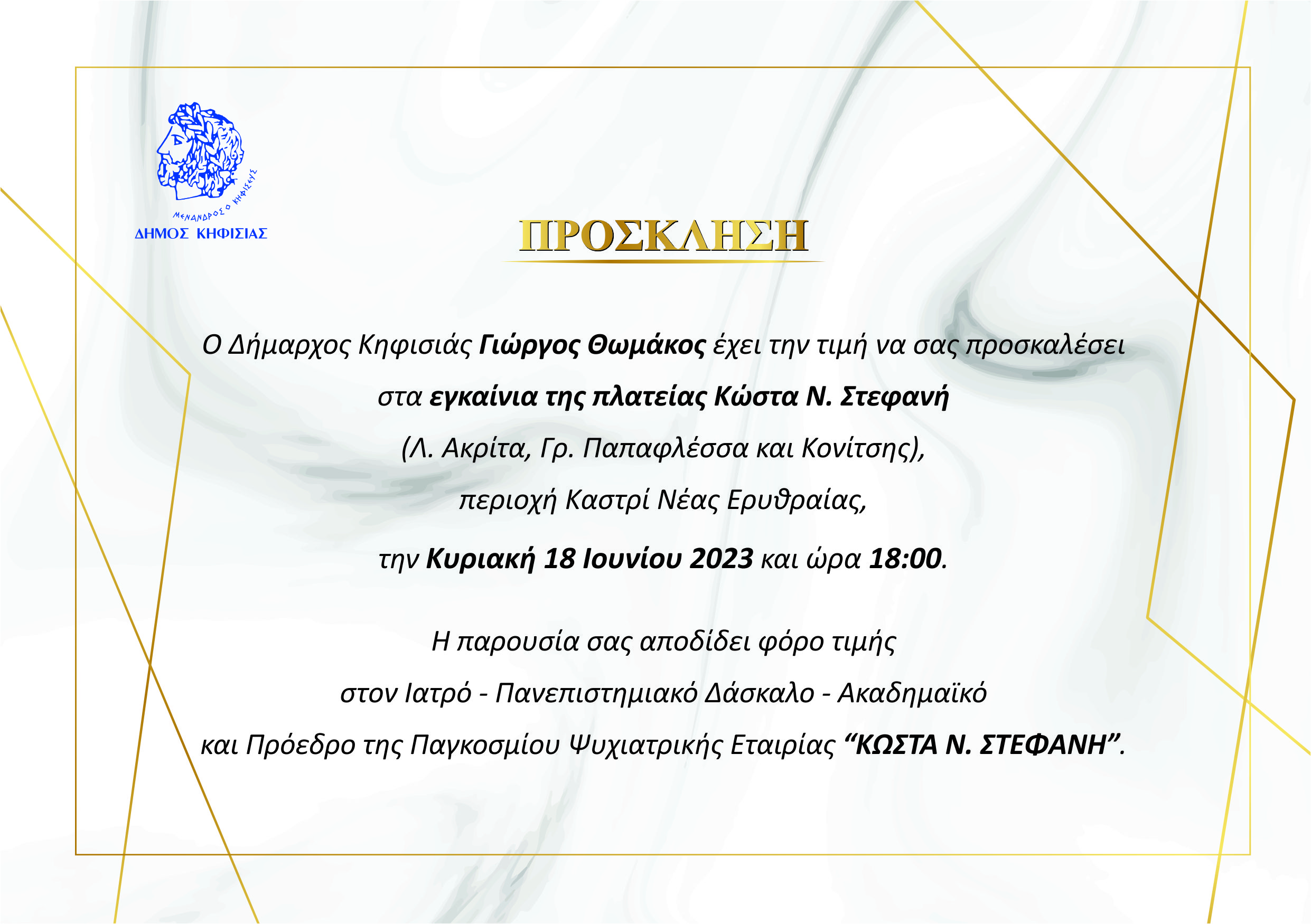 O Δήμαρχος Κηφισιάς Γιώργος Θωμάκος έχει τη τιμή να σας προσκαλέσει στα εγκαίνια της πλατείας Κώστα Ν. Στεφανή (Λ. Ακρίτα, Γρ. Παπαφλέσσα και Κονίτσης) περιοχή Καστρί Νέας Ερυθραίας, τη Κυριακή 18 Ιουνίου 2023 και ώρα 18.00