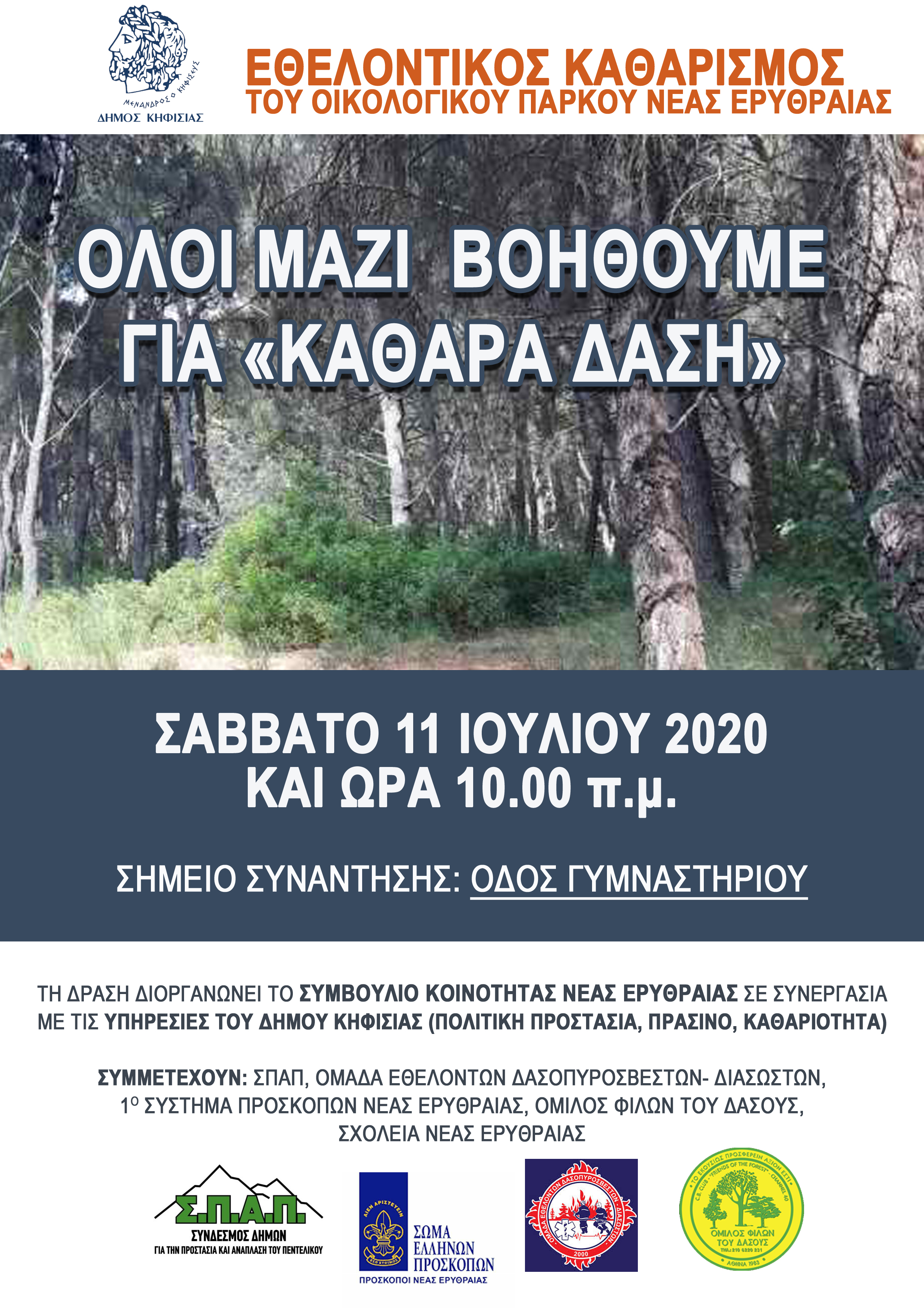 Συμμετέχουν: ΣΠΑΠ, Ομάδα Εθελοντών Δασoπυροσβεστών- Διασωστών, 1ο Σύστημα Προσκόπων Νέας Ερυθραίας, Όμιλος Φίλων του Δάσους, Σχολεία Νέας Ερυθραία