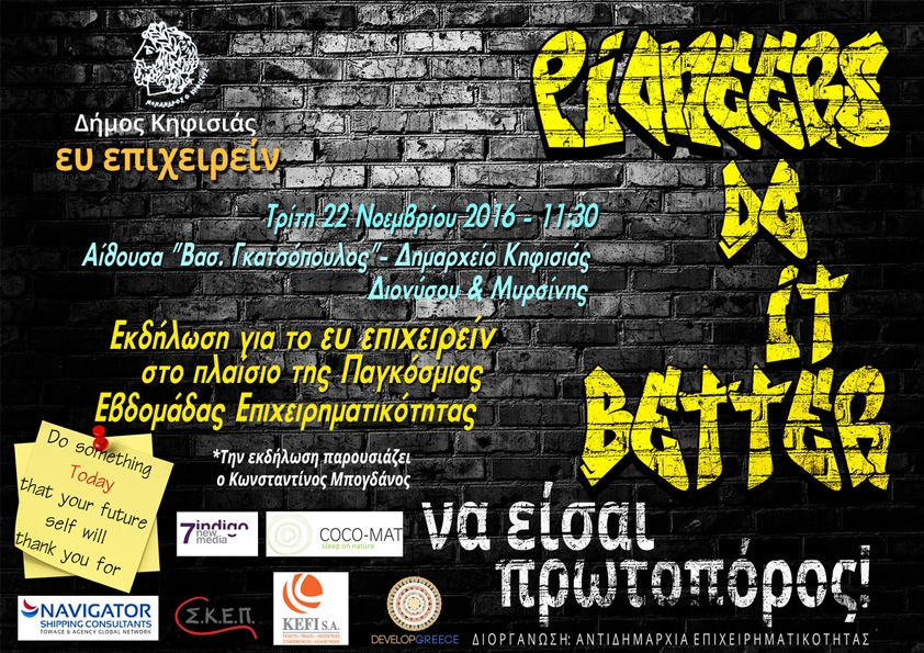 Στο πλαίσιο της Παγκόσμιας Εβδομάδας Επιχειρηματικότητας , η Αντιδημαρχία Επιχειρηματικότητας του Δήμου Κηφισιάς διοργανώνει για δεύτερη χρονιά, φέτος, εκδήλωση για τους μαθητές των Λυκείων του Δήμου μας, με θέμα την νεανική επιχειρηματικότητα.
