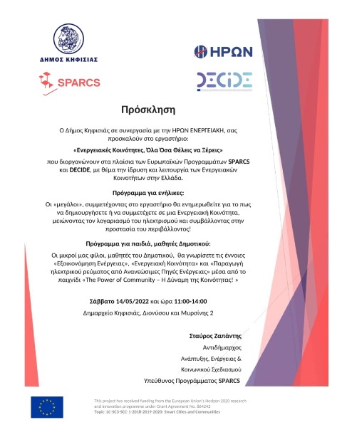 Ο ΔΗΜΟΣ ΚΗΦΙΣΙΑΣ και η ΗΡΩΝ ΕΝΕΡΓΕΙΑΚΗ διοργανώνουν, στα πλαίσια των Ευρωπαϊκών Προγραμμάτων SPARCS και DECIDE στα οποία συμμετέχουν αντιστοίχως, το εργαστήριο «Ενεργειακές Κοινότητες, Όλα Όσα Θέλεις να Ξέρεις».