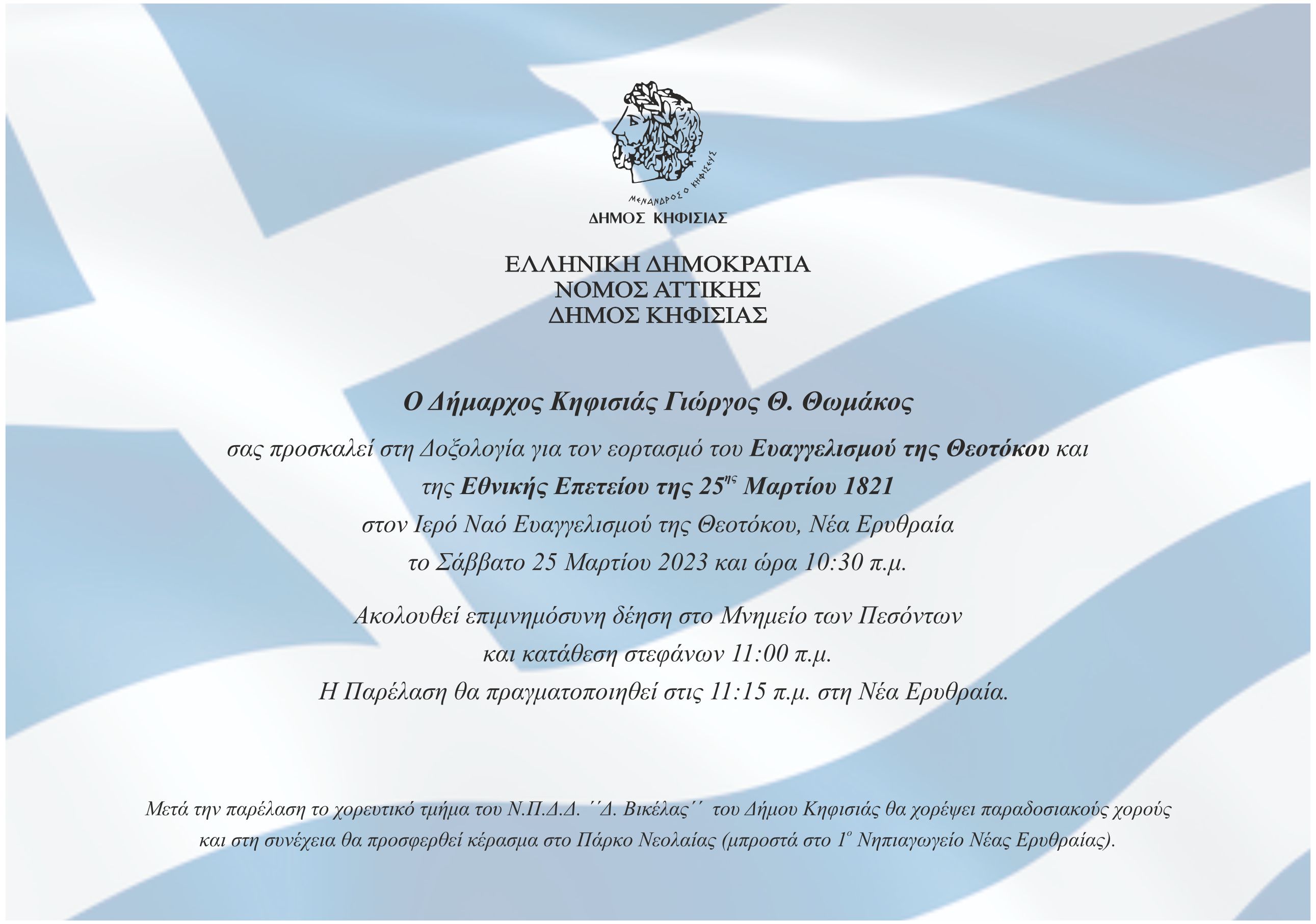 Ο Δήμος Κηφισιάς και ο Δήμαρχος Γιώργος Θωμάκος γιορτάζουν την Εθνική Επέτειο της 25ης Μαρτίου και προσκαλούν τους πολίτες να συμμετέχουν στις εορταστικές εκδηλώσεις, τιμώντας τη μνήμη των Αγωνιστών του ’21.