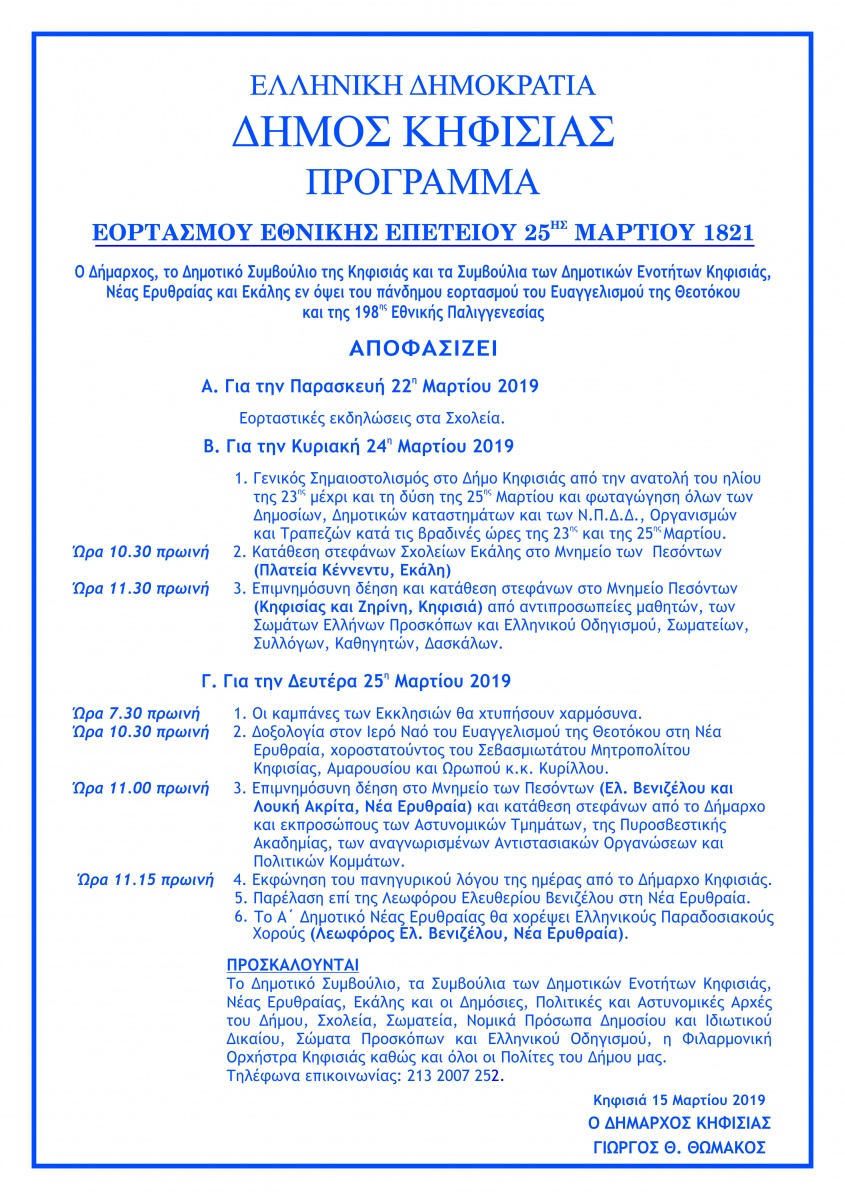 Ο Δήμος Κηφισιάς και ο Δήμαρχος Γιώργος Θωμάκος γιορτάζουν την Εθνική Επέτειο της 25ης Μαρτίου και προσκαλούν τους πολίτες να συμμετέχουν στις εορταστικές εκδηλώσεις, τιμώντας τη μνήμη των Αγωνιστών του ’21.
