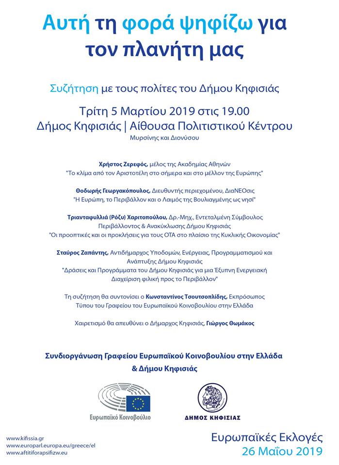 Οι πολίτες θα έχουν τη δυνατότητα να παρακολουθήσουν ζωντανά την εκδήλωση «Αυτή τη φορά ψηφίζω για τον πλανήτη μας» την οποία συνδιοργανώνουν ο Δήμος Κηφισιάς και το Γραφείο του Ευρωπαϊκού Κοινοβουλίου στην Ελλάδα.