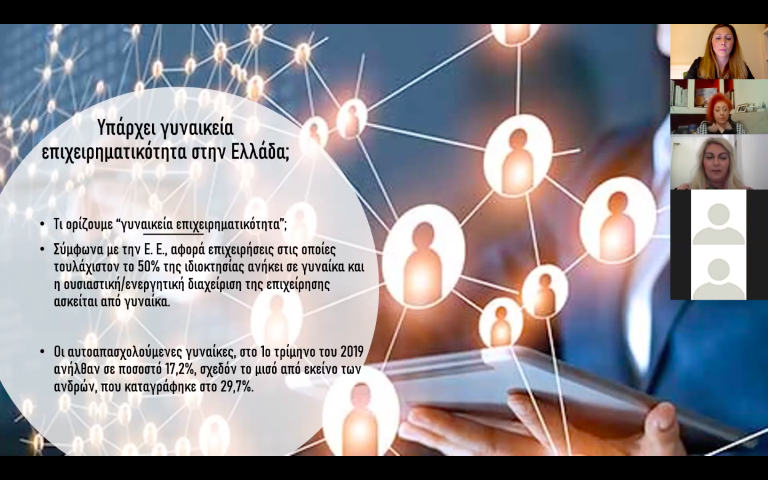 Τη Δευτέρα 21 Δεκεμβρίου πραγματοποιήθηκε διαδικτυακά η Θεματική Ενότητα Α της Ημερίδας Γυναικείας Επιχειρηματικότητας που αφορούσε εισηγήσεις από καταξιωμένους ομιλητές σε ένα βασικό θέμα άσκησης επιχειρηματικότητας.