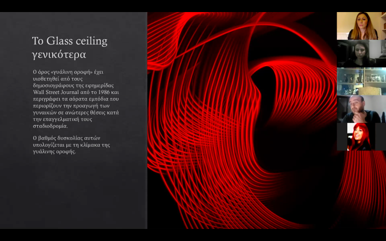 «Το φαινόμενο glass ceiling και η Γυναίκα Επαγγελματίας». Ο Δρ Χρήστος Μαντάς, Σύμβουλος σε θέματα οργανωσιακής συμπεριφοράς και κουλτούρας, αναφέρθηκε στα εμπόδια επαγγελματικής εξέλιξης των γυναικών, όπως για παράδειγμα τα παγιωμένα στερεότυπα και οι προκαταλήψεις από τους αρχαίους χρόνους μέχρι σήμερα, η μητρότητα, το μισθολογικό χάσμα, η άνιση πρόσβαση στα επαγγέλματα και στη χρηματοδότηση. Ο κ.Μαντάς ανέλυσε επίσης τους παράγοντες στους οποίους οφείλεται το φαινόμενο glass ceiling και πως μπορούμε να ξεφύγουμε από το glass ceiling για τις γυναίκες επιχειρηματίες.
