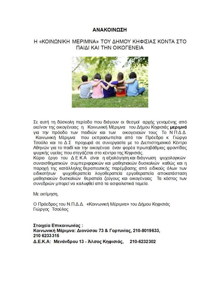 Η Κοινωνική Μέριμνα του Δήμου μας συνεργάζεται φέτος με το Διεπιστημονικό Κέντρο Αθηνών για το παιδί και την οικογένεια (Δ.Ε.Κ.Α ) για την αξιολόγηση και διάγνωση ψυχολογικών, συναισθηματικών, συμπεριφορικών και μαθησιακών δυσκολιών, καθώς και την παροχή της κατάλληλης θεραπευτικής παρέμβασης από ειδικούς.