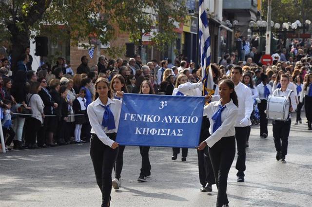 Η νεολαία της Κηφισιάς, της Νέας Ερυθραίας και της Εκάλης απέσπασε το πιο θερμό χειροκρότημα του Δημάρχου Κηφισιάς Γιώργου Θωμάκου, των εκπροσώπων της Δημοτικής Αρχής, των Αστυνομικών Τμημάτων, της Πυροσβεστικής Ακαδημίας, των εκπαιδευτικών αλλά των γονέων τους. Την παρέλαση άνοιξε το Λύκειο Ελληνίδων με τις παραδοσιακές στολές και κρατώντας την ελληνική σημαία ενώ η Φιλαρμονική του Δήμου μας υπό τη διεύθυνση του μαέστρού της Φίλιππου Χίου παιάνιζε καθόλη την διάρκεια της παρέλασης πατριωτικά εμβατήρια.