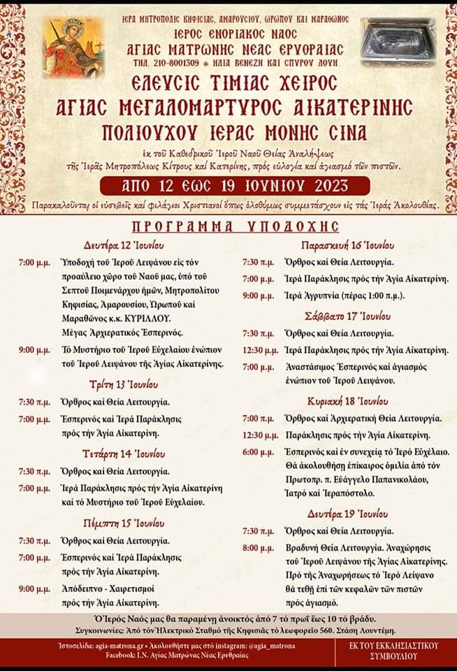 Ο Ιερός Ναός Αγίας Ματρώνας Νέας Ερυθραίας θα υποδεχθεί την Τίμια Χείρα της Αγίας Αικατερίνης, από Ιερά Μονή του Όρους Σινά.