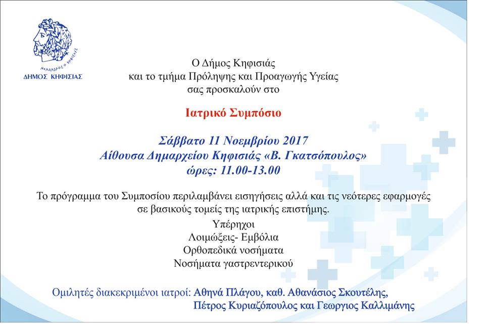 Ο Δήμος Κηφισιάς και το Τμήμα Πρόληψης και Προαγωγής Υγείας σας προσκαλούν στο Ιατρικό Συμπόσιο το Σάββατο 11 Νοεμβρίου 2017 στην Αίθουσα Δημαρχείου Κηφισιάς « Β. Γκατσόπουλος» και ώρες: 11.00-13.00.
