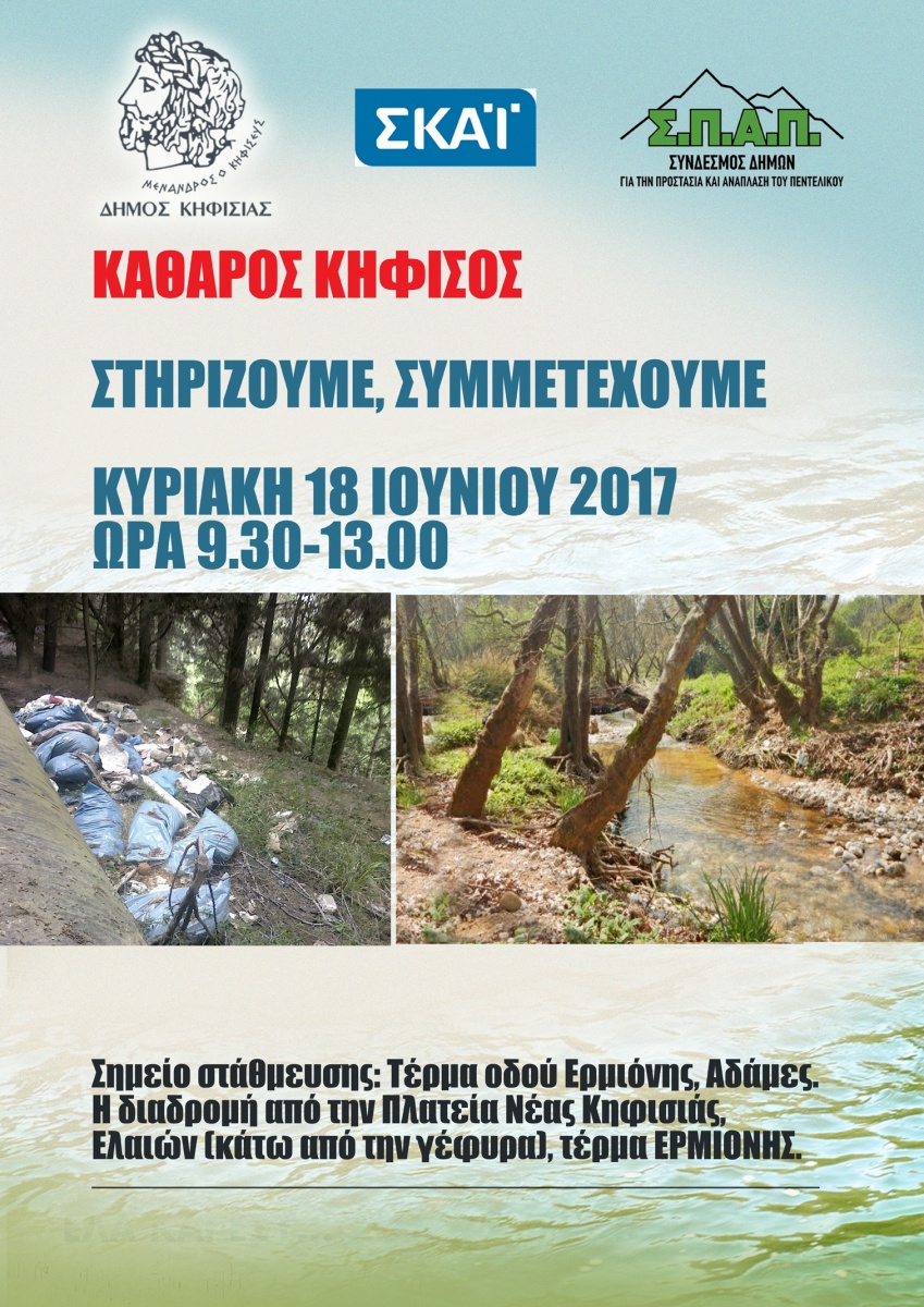 Ο Δήμος Κηφισιάς προγραμματίζει μετά από χρόνια, δράση καθαρισμού του ποταμού Κηφισού την Κυριακή 18 Ιουνίου 2017, σε συνεργασία με τον Σύνδεσμο για την Προστασία και την Ανάπλαση του Πεντελικού (ΣΠΑΠ) και τον τηλεοπτικό σταθμό ΣΚΑΙ.