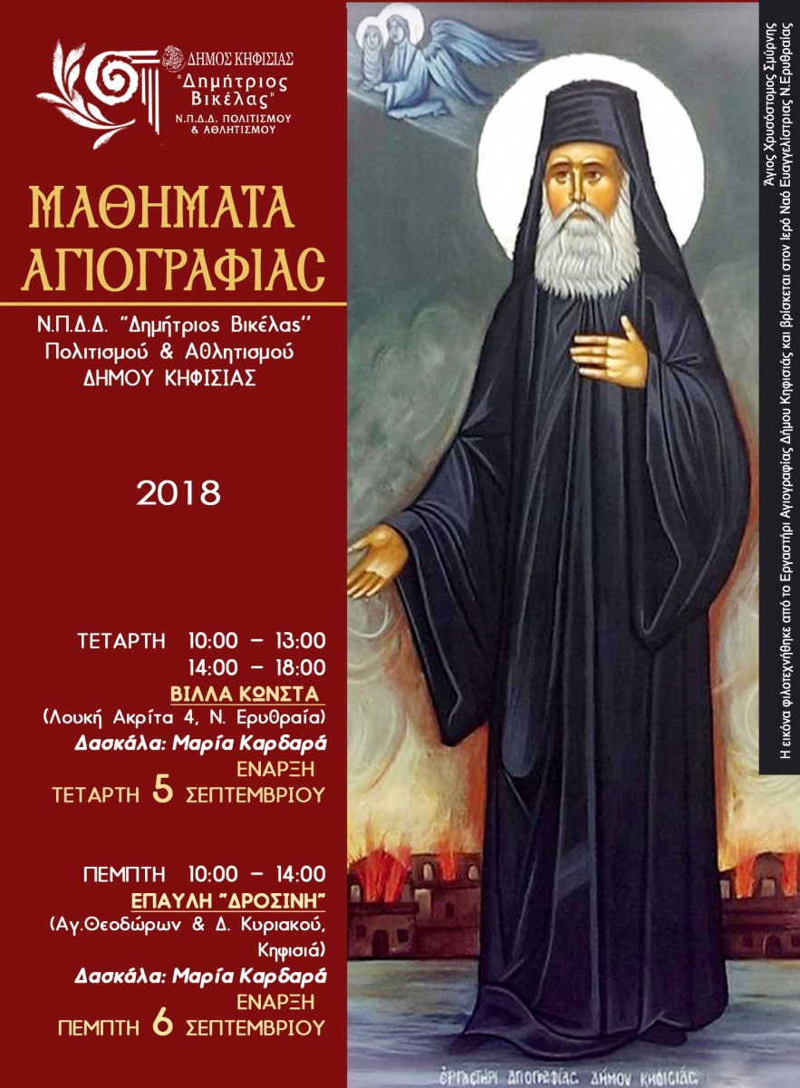 Ξεκινούν σήμερα τα μαθήματα Αγιογραφίας από το Ν.Π.Δ.Δ. Πολιτισμού & Αθλητισμού «Δημήτριος Βικέλας» του Δήμου Κηφισιάς, στο πλαίσιο των μαθημάτων καλλιτεχνικής παιδείας, με δασκάλα την κα Μαρία Καρδαρά και τα οποία θα πραγματοποιούνται ως εξής: