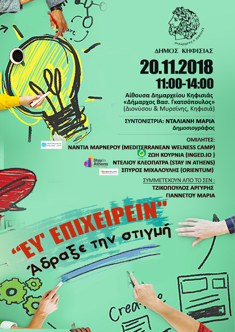 Την Τρίτη 20 Νοεμβρίου θα πραγματοποιηθεί εκδήλωση επιχειρηματικότητας που θα απευθύνεται σε μαθητές λυκείων του Δήμου Κηφισιάς. Ο Δήμος Κηφισιάς δραστηριοποιείται ενεργά με σκοπό την επένδυση στους νέους και στόχος της συγκεκριμένης Δράσης είναι να εμπνεύσει αλλά και να κινητοποιήσει τα νέα παιδιά μέσα από τις παρουσιάσεις πετυχημένων επιχειρηματιών, οι οποίοι θα εξιστορήσουν τις προσωπικές τους ιστορίες και εμπειρίες, τις επιλογές τους, τις επιτυχίες αλλά και δυσκολίες που συνάντησαν, καθώς επίσης θα αναλύσουν και επίκαιρα θέματα τα οποία έχουν ιδιαίτερο ενδιαφέρον.