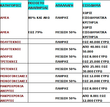 Επίσης μειώσεις και απαλλαγές αποφασίστηκαν σε όλες τις ευπαθείς κατηγορίες (άποροι, ειδικές ανάγκες, πολύτεκνοι, τρίτεκνοι, μονογονειακές, μακροχρόνια άνεργοι).