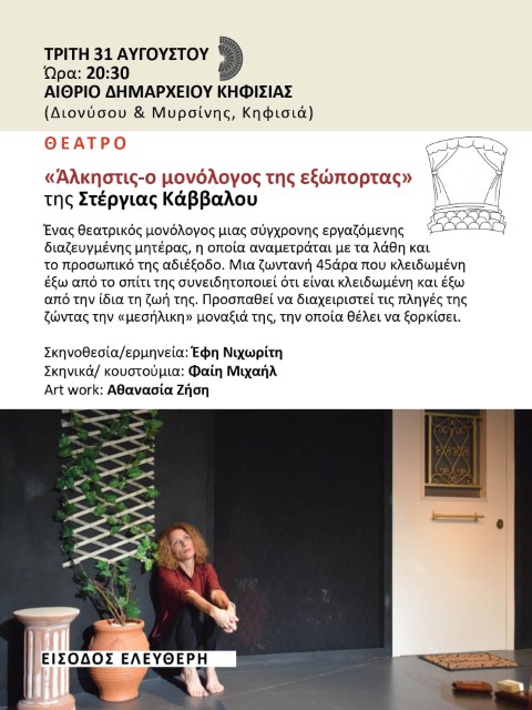 ΘΕΑΤΡΟ «Άλκηστις-ο μονόλογος της εξώπορτας» της Στέργιας Κάββαλου Ένας θεατρικός μονόλογος μιας σύγχρονης εργαζόμενης διαζευγμένης μητέρας, η οποία αναμετράται με τα λάθη και το προσωπικό της αδιέξοδο. Μια ζωντανή 45άρα που κλειδωμένη έξω από το σπίτι της συνειδητοποιεί ότι είναι κλειδωμένη και έξω από την ίδια τη ζωή της. Προσπαθεί να διαχειριστεί τις πληγές της ζώντας την «μεσήλικη» μοναξιά της, την οποία θέλει να ξορκίσει.