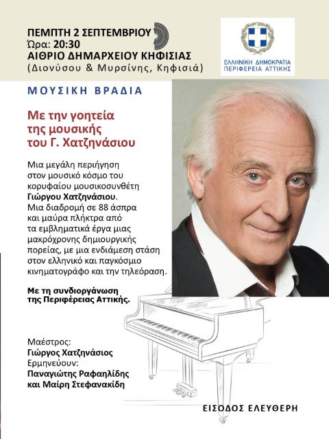ΜΟΥΣΙΚΗ ΒΡΑΔΙΑ Με την γοητεία της μουσικής του Γ. Χατζηνάσιου Μια μεγάλη περιήγηση στον μουσικό κόσμο του κορυφαίου μουσικοσυνθέτη Γιώργου Χατζηνάσιου. Μια διαδρομή σε 88 άσπρα και μαύρα πλήκτρα από τα εμβληματικά έργα μιας μακρόχρονης δημιουργικής πορείας, με μια ενδιάμεση στάση στον ελληνικό και παγκόσμιο κινηματογράφο και την τηλεόραση. Με τη συνδιοργάνωση της Περιφέρειας Αττικής Μαέστρος: Γιώργος Χατζηνάσιος Ερμηνεύουν: Παναγιώτης Ραφαηλίδης και Μαίρη Στεφανακίδη