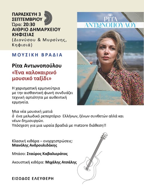 ΜΟΥΣΙΚΗ ΒΡΑΔΙΑ Ρίτα Αντωνοπούλου «Ένα καλοκαιρινό μουσικό ταξίδι» Η χαρισματική ερμηνεύτρια με την αισθαντική φωνή συνδυάζει τεχνική αρτιότητα με αυθεντική ερμηνεία. Μια νέα μουσική ματιά σ̓̓ ένα μελωδικό ρεπερτόριο Ελλήνων, ξένων συνθετών αλλά και νέων δημιουργών. Υπόσχεση για μια ωραία βραδιά με matzore διάθεση!! Κλασική κιθάρα – ενορχηστρώσεις: Μανόλης Ανδρουλιδάκης Μπάσο: Σταύρος Καβαλιεράτος Ακουστική κιθάρα: Μιχάλης Ατσάλης