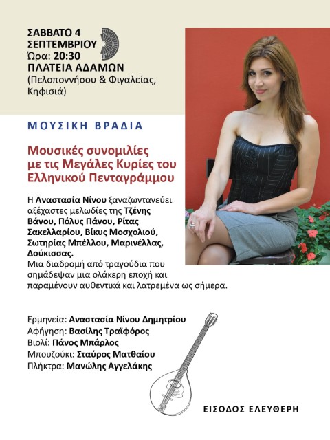ΜΟΥΣΙΚΗ ΒΡΑΔΙΑ Μουσικές συνομιλίες με τις Μεγάλες Κυρίες του Ελληνικού Πενταγράμμου Η Αναστασία Νίνου ξαναζωντανεύει αξέχαστες μελωδίες της Τζένης Βάνου, Πόλυς Πάνου, Ρίτας Σακελλαρίου, Βίκυς Μοσχολιού, Σωτηρίας Μπέλλου, Μαρινέλλας, Δούκισσας. Μια διαδρομή από τραγούδια που σημάδεψαν μια ολάκερη εποχή και παραμένουν αυθεντικά και λατρεμένα ως σήμερα. Eρμηνεία: Αναστασία Νίνου Δημητρίου Αφήγηση: Βασίλης Τραϊφόρος Βιολί: Πάνος Μπάρλος Μπουζούκι: Σταύρος Ματθαίου Πλήκτρα: Μανώλης Αγγελάκης