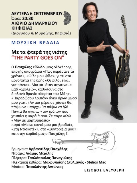 ΜΟΥΣΙΚΗ ΒΡΑΔΙΑ Με τα φτερά της νιότης “ΤHE PARTY GOES ON” Ο Πασχάλης είδωλο μιας ολόκληρης εποχής υπογράφει «Πώς περάσανε τα χρόνια», «Φίλε μου Φίλε», γιατί στα μονοπάτια της ζωής «Οι φίλοι είναι για πάντα». Μια και όταν πηγαίναμε μαζί «Σχολείο», καθόσουνα στο διπλανό θρανίο «Κορίτσι του Μάη». «Παραδώσου λοιπόν» άνευ όρων μωρό μου γιατί «Αν μια μέρα σε χάσω» θα πάψω να υπάρχω θα πάψω να ζώ! Πάντα θα αγαπώ «τον τρόπο» που χτυπάει η καρδιά σου. Σε παρακαλώ «Μην με μαρτυρήσεις» παρά «Μείνε κοντά μου μια βραδιά», «Στη Ντισκοτέκ», στη «Συντροφιά μου» και στην καρδιά μας ο Πασχάλης !! Eρμηνεία: Αρβανιτίδης Πασχάλης Nτράμς: Λιάμης Μιχάλης Πλήκτρα: Τσαλόπουλος Παναγιώτης Hλεκτρική κιθάρα: Μακρυπλίδης Στυλιανός - Stelios Mac Mπάσο: Πιτσολάντης Αντώνιος
