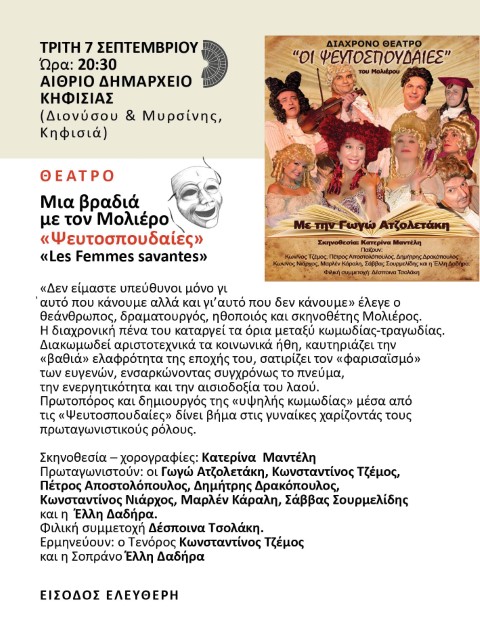 ΘΕΑΤΡΟ Μια βραδιά με τον Μολιέρο «Ψευτοσπουδαίες» «Les Femmes savantes» «Δεν είμαστε υπεύθυνοι μόνο γι ̍αυτό που κάνουμε αλλά και γι’αυτό που δεν κάνουμε» έλεγε o θεάνθρωπος, δραματουργός, ηθοποιός και σκηνοθέτης Μολιέρος. Η διαχρονική πένα του καταργεί τα όρια μεταξύ κωμωδίας-τραγωδίας. Διακωμωδεί αριστοτεχνικά τα κοινωνικά ήθη, καυτηριάζει την «βαθιά» ελαφρότητα της εποχής του, σατιρίζει τον «φαρισαϊσμό» των ευγενών, ενσαρκώνοντας συγχρόνως το πνεύμα, την ενεργητικότητα και την αισιοδοξία του λαού. Πρωτοπόρος και δημιουργός της «υψηλής κωμωδίας» μέσα από τις «Ψευτοσπουδαίες» δίνει βήμα στις γυναίκες χαρίζοντάς τους πρωταγωνιστικούς ρόλους. Σκηνοθεσία – χορογραφίες: Κατερίνα Μαντέλη Πρωταγωνιστούν: οι Γωγώ Ατζολετάκη, Κωνσταντίνος Τζέμος, Πέτρος Αποστολόπουλος, Δημήτρης Δρακόπουλος, Κωνσταντίνος Νιάρχος, Μαρλέν Κάραλη, Σάββας Σουρμελίδης και η Έλλη Δαδήρα. Φιλική συμμετοχή Δέσποινα Τσολάκη. Ερμηνεύουν: ο Τενόρος Κωνσταντίνος Τζέμος και η Σοπράνο Έλλη Δαδήρα