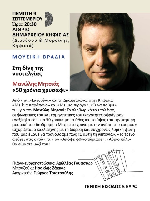 ΜΟΥΣΙΚΗ ΒΡΑΔΙΑ Στη δίνη της νοσταλγίας Μανώλης Μητσιάς «50 χρόνια χρυσάφι» Από την…«Ελευσίνα» και τη Δραπετσώνα, στην Κηφισιά «Με ένα παράπονο» και «Με μια πιρόγα», «Τι να πούμε» τι;…για τον Μανώλη Μητσιά; Το πληθωρικό του ταλέντο, οι φωνητικές του και ερμηνευτικές του ικανότητες σφράγισαν ανεξίτηλα εδώ και 50 χρόνια με το ήθος και το ύφος του την λαμπρή μουσική του διαδρομή. «Μετρώ το χρόνο με την αγάπη του κόσμου» ισχυρίζεται ο καλλιτέχνης με τη δωρική και συγχρόνως λυρική φωνή που μας έμαθε να τραγουδάμε πως «Σ̕αυτή τη γειτονιά», «Το τρένο φεύγει στις οκτώ», τι κ΄αν «Απόψε φθινοπώριασε», «Αύριο πάλι» θα είμαστε μαζί του! Πιάνο-ενορχηστρώσεις: Αχιλλέας Γουάστωρ Μπουζούκι: Ηρακλής Ζάκκας Ακορντεόν: Γιώργος Τσιατσούλης