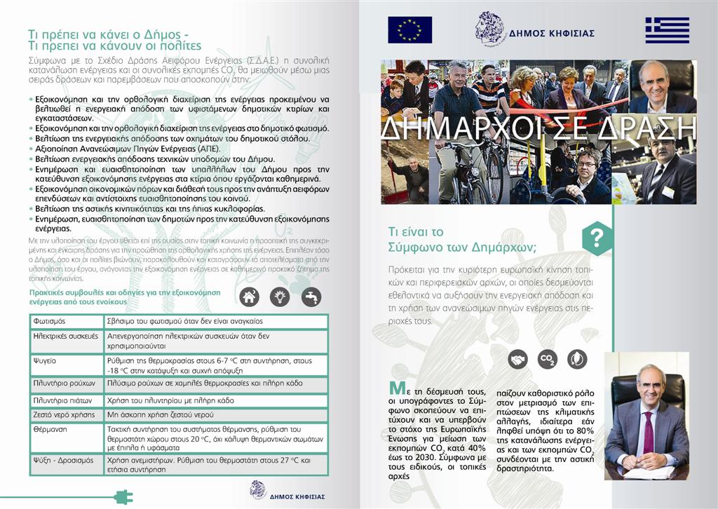 Κατά τη διάρκεια της ημερίδας μοιράσθηκε στους παρευρισκόμενους ένα κομψό τετρασέλιδο φυλλάδιο με χρηστικές πληροφορίες για τον τρόπο με τον οποίο οι δημότες του Δήμου Κηφισιάς θα εξοικονομήσουν ενέργεια και χρήματα. Στο φυλλάδιο το οποίο επισυνάπτεται και είναι διαθέσιμο για τους δημότες στην ιστοσελίδα και τις Υπηρεσίες του Δήμου Κηφισιάς, περιλαμβάνονται τέσσερις ενότητες: