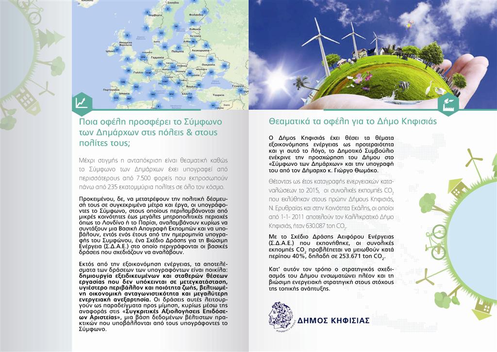 Με τη συμμετοχή αιρετών και στελεχών του Δήμου Κηφισιάς αλλά και πολιτών πραγματοποιήθηκε σήμερα Παρασκευή 8 Σεπτεμβρίου 2017 στην Αίθουσα «Δήμαρχος Βασίλης Γκατσόπουλος» του Δήμου Κηφισιάς ημερίδα με θέμα: «Το Σύμφωνο των Δημάρχων και τα οφέλη για τους δημότες του Δήμου Κηφισιάς» .Κατά την διάρκεια της ημερίδας που διοργάνωσε ο Δήμος Κηφισιάς πραγματοποιήθηκαν εισηγήσεις για τα περιβαλλοντικά, οικονομικά και κοινωνικά οφέλη της εξοικονόμησης ενέργειας με βάση την Πανευρωπαϊκή Κίνηση «Σύμφωνο των Δημάρχων».