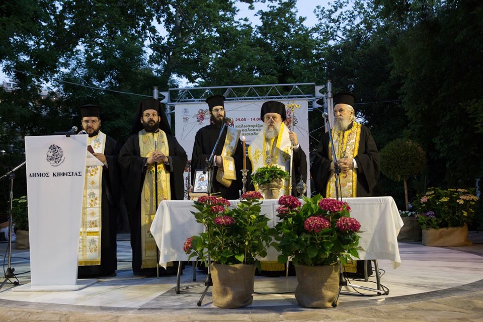 Τη λιτή τελετή εγκαινίων ευλόγησε ο Μητροπολίτης Κηφισίας, Αμαρουσίου και Ωρωπού κ. Κύριλλος. Ο Σεβασμιώτατος αναφέρθηκε στις μνήμες των παιδικών του χρόνων από την Ανθοκομική Κηφισιάς και έδωσε τις ευχές του για τη συνέχεια του ιστορικού θεσμού της Κηφισιάς.